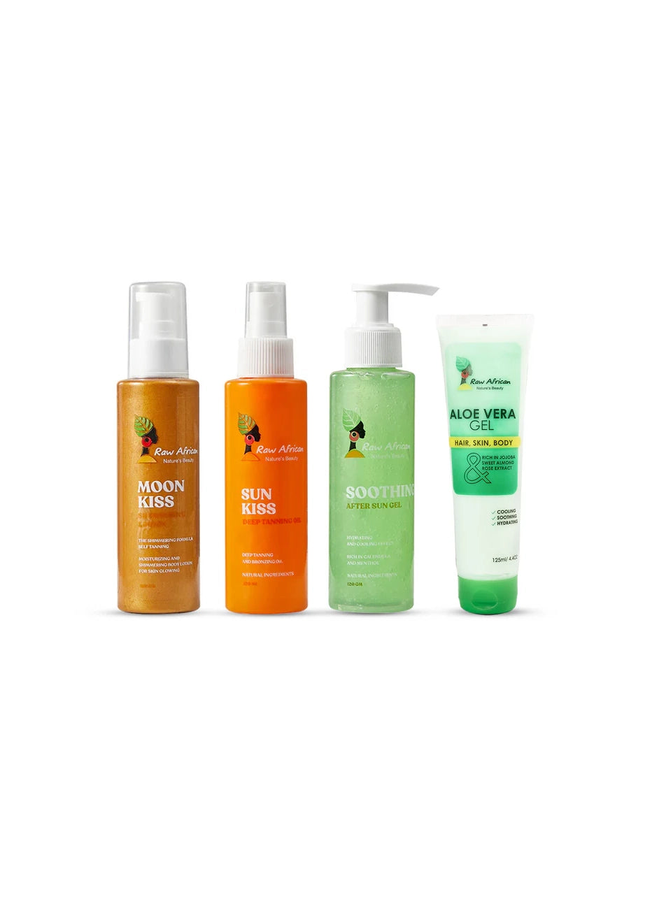 The Beach Essentials Bundle brings together four summer must haves: a soothing Aloe Vera Gel to calm and hydrate the skin, a nourishing Sun Kiss Tanning Oil for a rich bronze glow, a luminous Moon Kiss Shimmering Lotion for instant radiance, and a refreshing After Sun Gel to cool and restore sun exposed skin. A perfectly curated set for hydrated, glowing, beach ready skin all day.