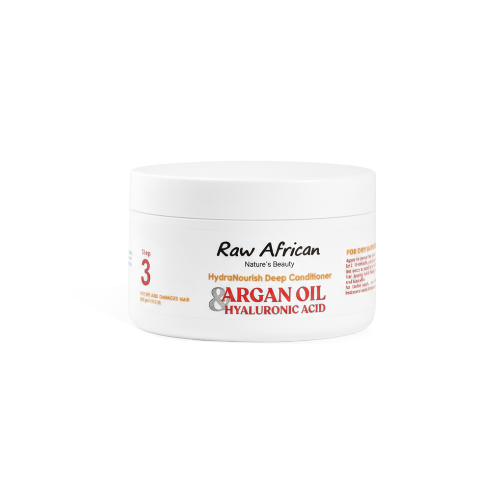 أطلق العنان لكامل إمكانات شعرك مع الخطوة الثالثة من الاستحمام، بلسم HydraNourish Deep Conditioner من Raw African.